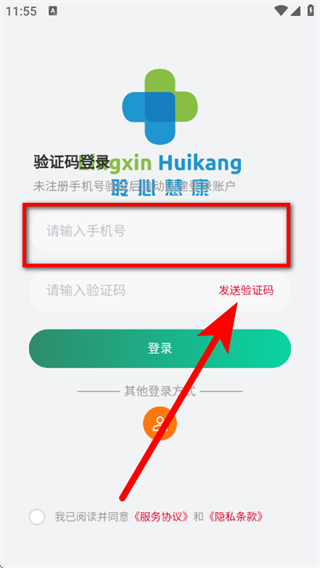 3、在验证码登录页面,输入手机号,点击发送验证码。
