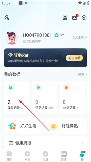 2、进入“我”的页面后,点击体重记录/天选项。