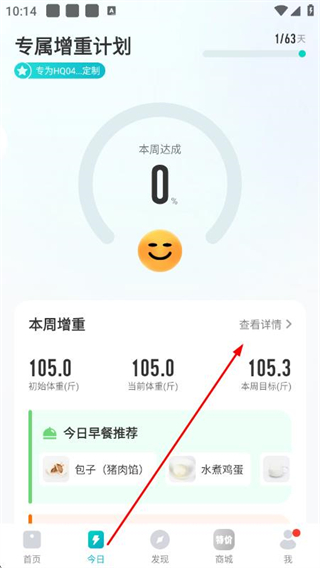 2、在今日页面点击查看详情,进入专属增重计划页面。