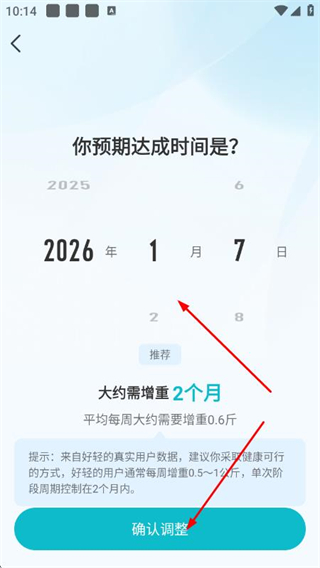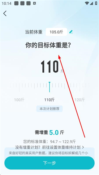 5、在调整目标页面,设置目标体重,然后点击下一步。