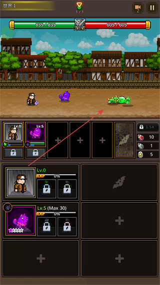 2、进入世界1关卡,操控角色与像素兽协同作战,对阵敌方怪物。