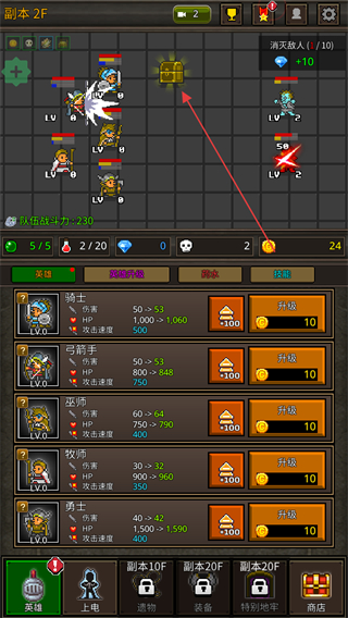 1、在副本2F中,操控英雄移动至金色宝箱处,获取宝箱奖励。