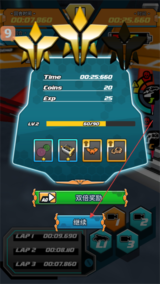 4、比赛结束后,查看结算界面的Time、Coins等数据与奖励,点击继续按钮返回游戏界面,推进后续游戏进程。