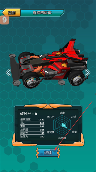 1、在选择四驱车界面,选定破风号-R后,可查看其最高速度、扭力等属性,确认后点击继续按钮,进入后续的游戏流程。