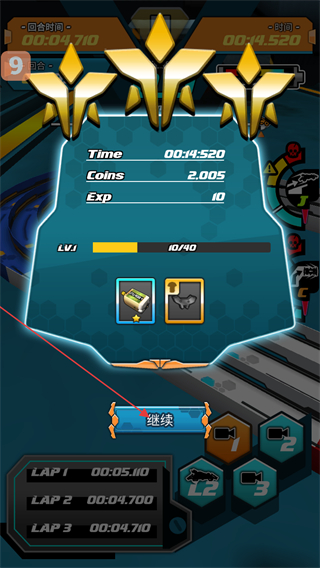 4、比赛结束后,查看结算界面的Time、Coins等数据,获取对应的奖励,点击继续按钮回到游戏相关界面,推进后续进程。