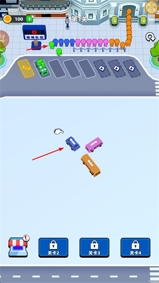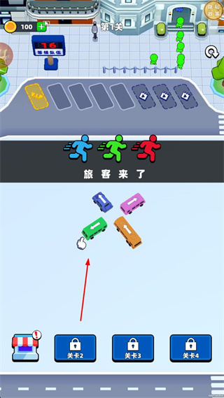 1、观察界面中出现的不同颜色旅客,选择对应颜色的车辆,点击该车辆,将其移动至候车队伍旁的车位。