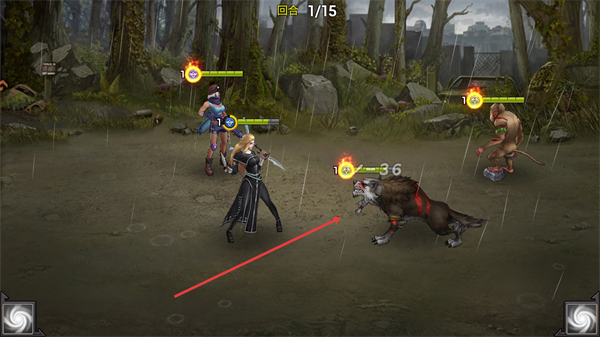 1、回合1选择目标敌人如狼型怪物,发起攻击,推进战斗流程。