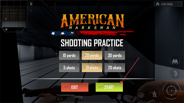 3、选择训练参数如20码、10发,点击START开始射击练习。