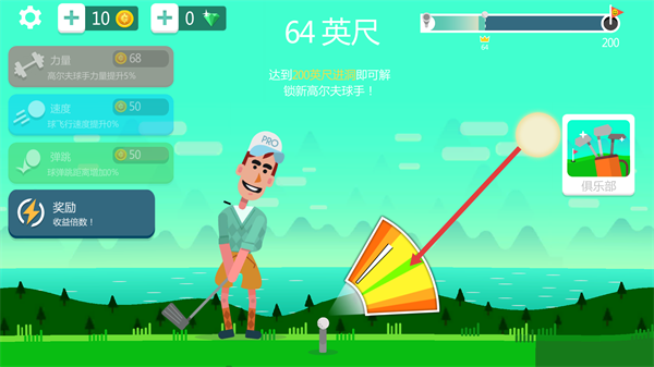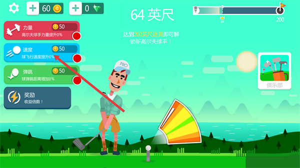 1、在游戏界面中,可消耗50金币升级【速度】属性,提升球的飞行速度,助力向200英尺的目标推进。
