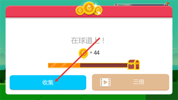 4、击球结束后,可以查看高尔夫球落地的位置(在求道上),同时点击【收集】按钮获取+44金币奖励。