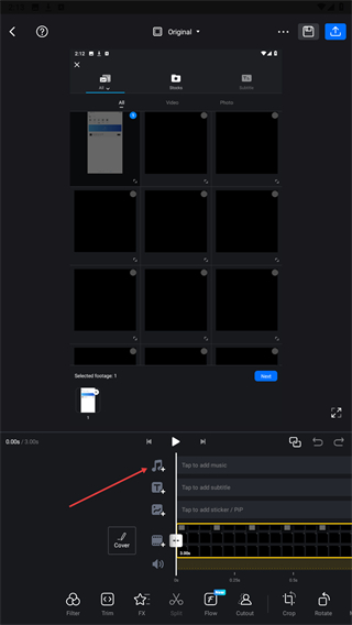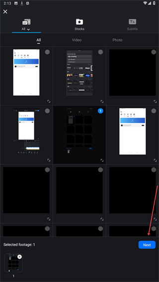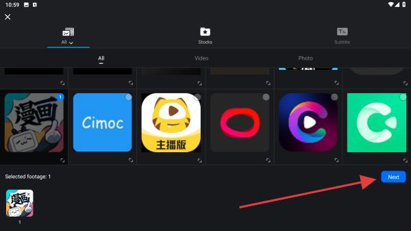 3、进入素材选择页,选中需编辑的视频/图片,点击Next下一步。