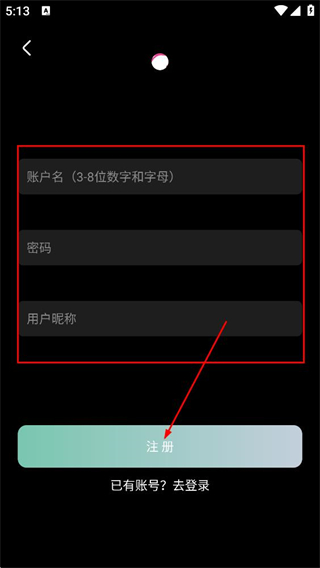 4、在注册页面,填写账户名、密码、用户昵称,点击注册,完成账号注册。