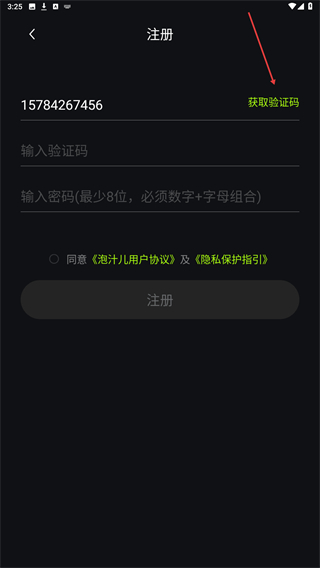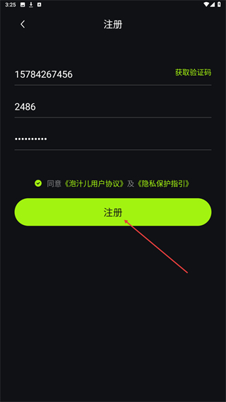 1、启动泡汁儿app,进入时点击右上角注册的按钮。
