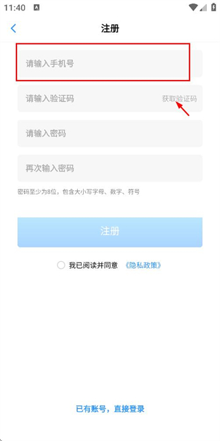 2、在注册账号页面填写手机号码后,点击获取验证码。