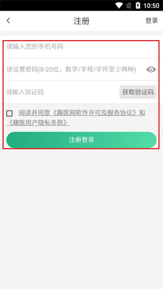 4、输入手机号码、设置密码、获取并填写验证码,勾选同意相关协议后点击注册登录。