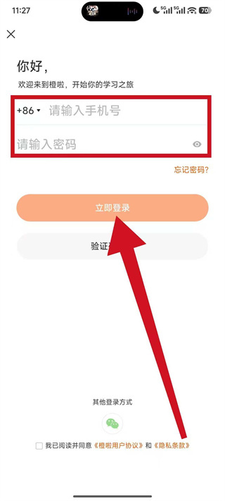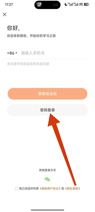 1、打开橙啦,在初始登录界面点击其他登录方式,展开更多登录选项。