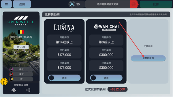 1、进入大奖赛的选择赞助商界面后,查看LUXINA和WANCHAI的目标排名等信息,点击去赞助商部按钮推进赞助选择流程。