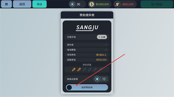3、在赞助商推荐界面查看SANGJU的目标排名等条件,确认后点击界面中的选择赞助商按钮,即可选定该赞助商。