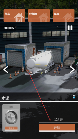 1、选择水泥车型,点击开始按钮,消耗1241$进入运输关卡。