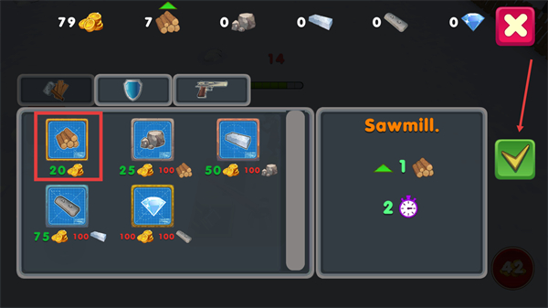 3、在建造界面,消耗金币选择木材道具,点击右侧按钮解锁建筑,用于生产资源。