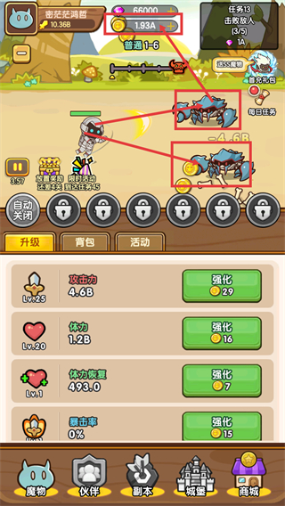 3、击败关卡敌人后会获得金币奖励,积累金币可用于后续强化伙伴属性,推进关卡进度。