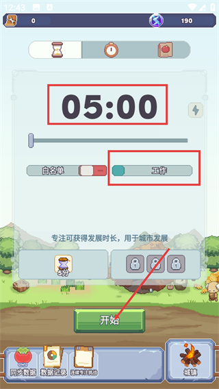 2、进入专注界面后,选择【工作】模式并点击【开始】,即可启动5分钟的专注计时,获取发展时长。