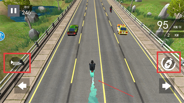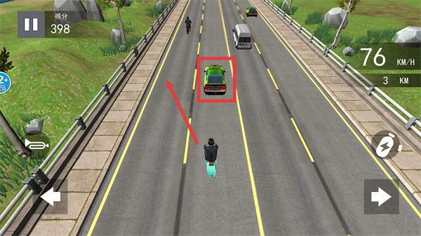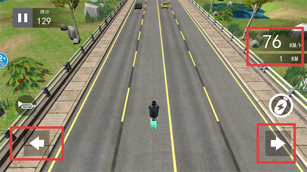 3、使用右侧的【加速按钮】触发加速,让摩托车快速前进,超越前方车辆保持领先地位同时按住喇叭提醒前方车辆。