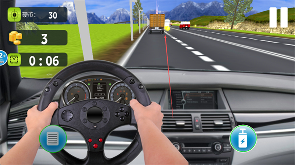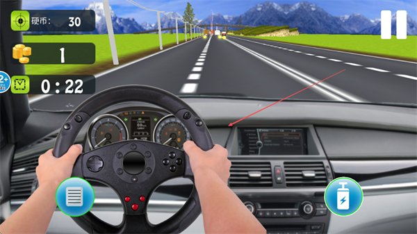 3、操控方向盘驾驶赛车,在道路上行驶,收集沿途的硬币,积累数量。