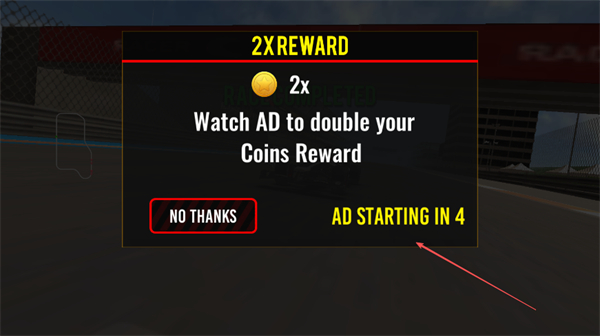 4、赛事结束后,可选择观看广告AD翻倍金币奖励,或点NOTHANKS直接领取奖励。