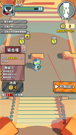 1、查看狙击塔属性,消耗资源选择改造,点击开始战斗进入关卡,准备迎敌。