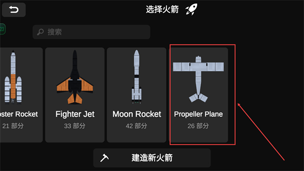 1、选择【PropellerPlane】-【26部分】类飞行器,零件数量少且结构简单,适合新手快速熟悉组装与发射的基础流程。