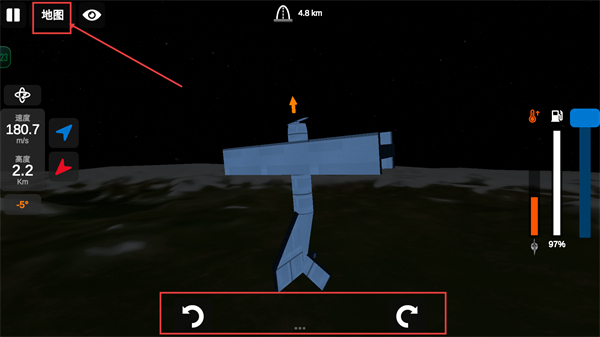 4、到达高海拔区域后使用顶部眼睛按钮切换视角,观察周围太空环境,同时留意速度与燃料变化确保安全。