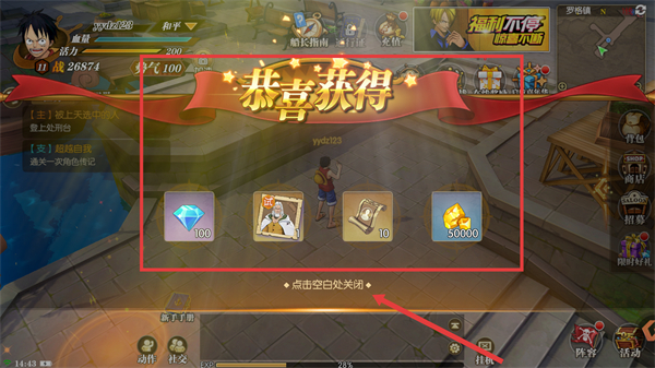 1、获得【钻石100】-【招募券10】-【金币50000】后,点击空白处关闭弹窗,可用于后续伙伴招募提升战力。