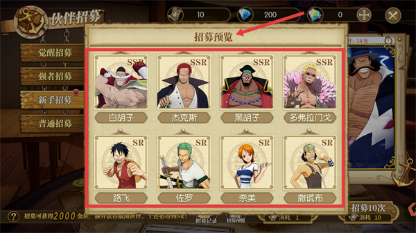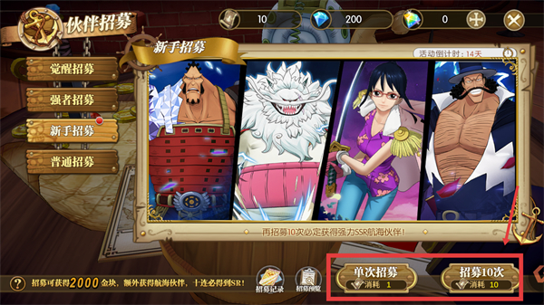 3、新手招募时选择【招募10次】,消耗10个招募券,必定获得强力【SSR航海伙伴】,快速提升队伍实力。