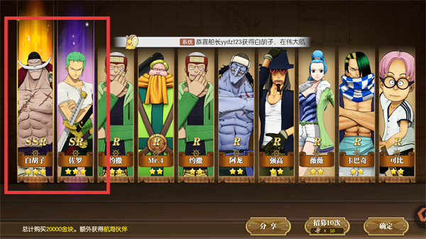 4、招募后获得【SSR白胡子】-【SR佐罗】等伙伴,点击确定关闭界面,继续积累资源进行下一轮招募。