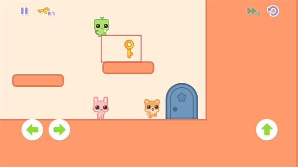 3、让绿色小动物登上高处平台,获取场景中的【钥匙】道具,再移动到【蓝色门】处。