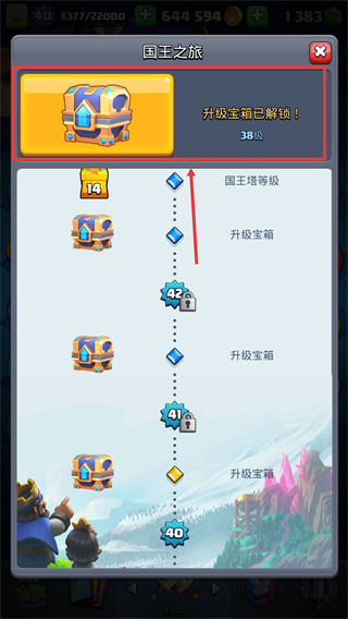 4、国王之旅中解锁【升级宝箱】,提升国王塔等级至【38级】,获取更多进阶奖励。