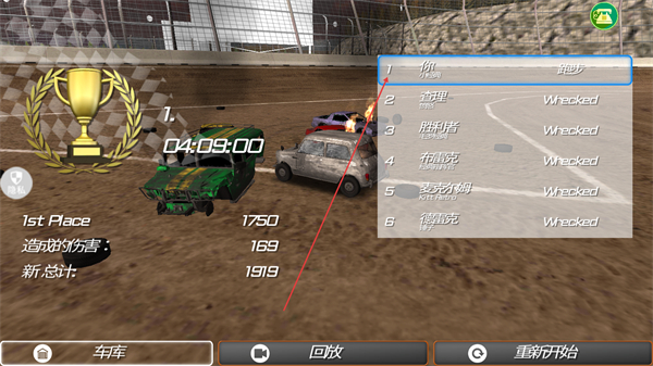 4、比赛结束后获得第1名,可查看战绩,选择返回车库或重新开始。