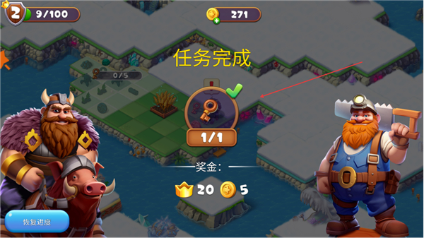 4、成功获取密钥,显示任务完成,领取20金币等奖励。