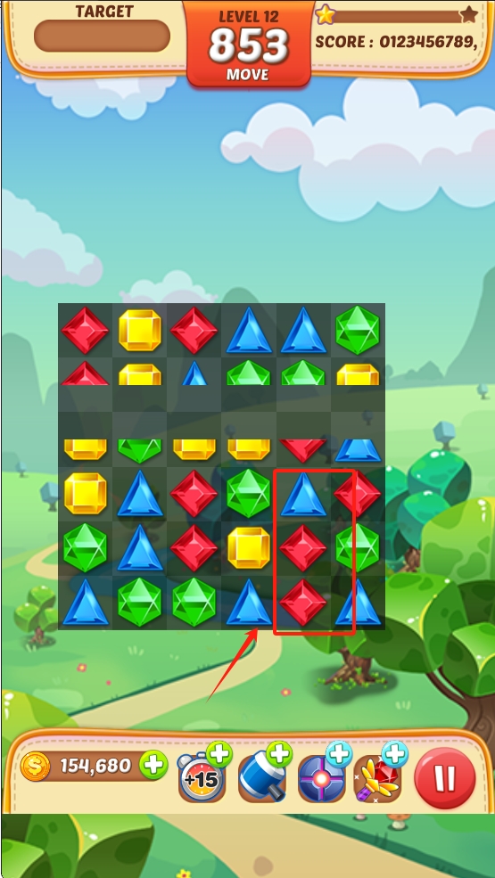 2、点击两个相邻的红宝石,交换位置形成三连消除。