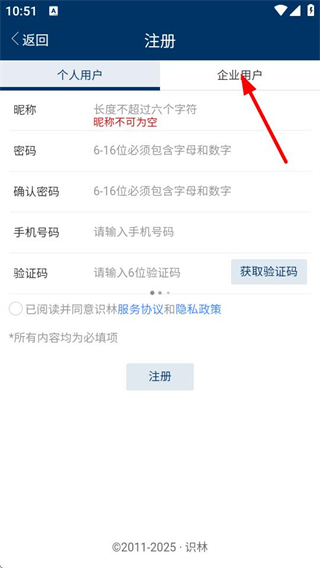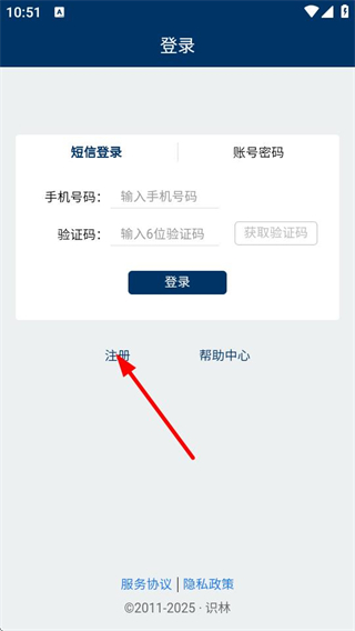 1、进入识林登录页面后,点击注册选项,可进入注册页面。