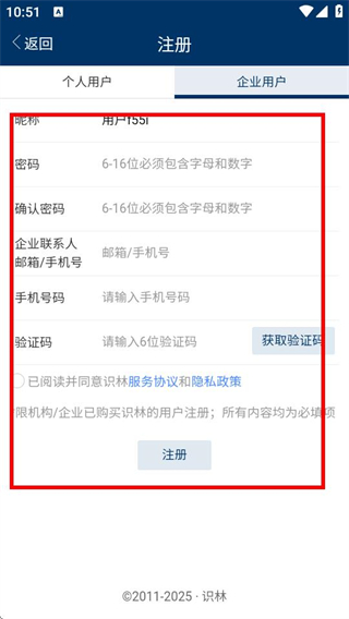 3、在企业用户注册页面,填写所需信息并勾选协议后,点击注册按钮即可完成企业用户注册。