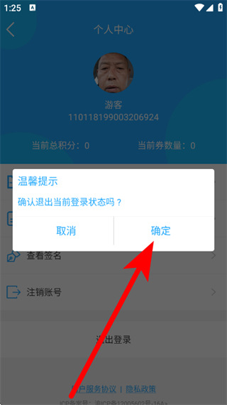 3、在弹窗中,点击确定按钮,完成退出登录操作。