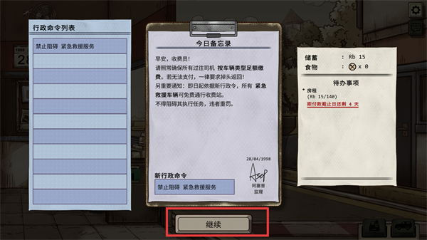 1、仔细阅读今日备忘录中的行政命令内容,点击继续按钮进入工作流程。