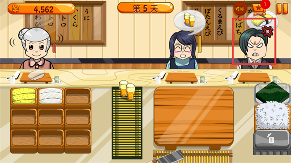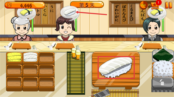 2、在【第5天】经营界面,取对应食材制作【寿司】,将成品交付给需求顾客,积累营收。
