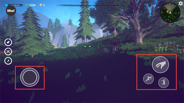 2、左侧为【移动轮盘】控制角色移动,右侧为互动键位与场景元素互动,探索野外区域。