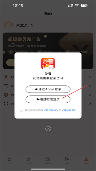 1、打开妙看的应用,在首页底部点击我的按钮。