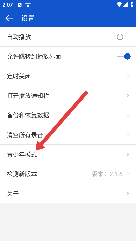 2、在设置界面中,点击青少年模式选项,进入青少年模式设置页面。