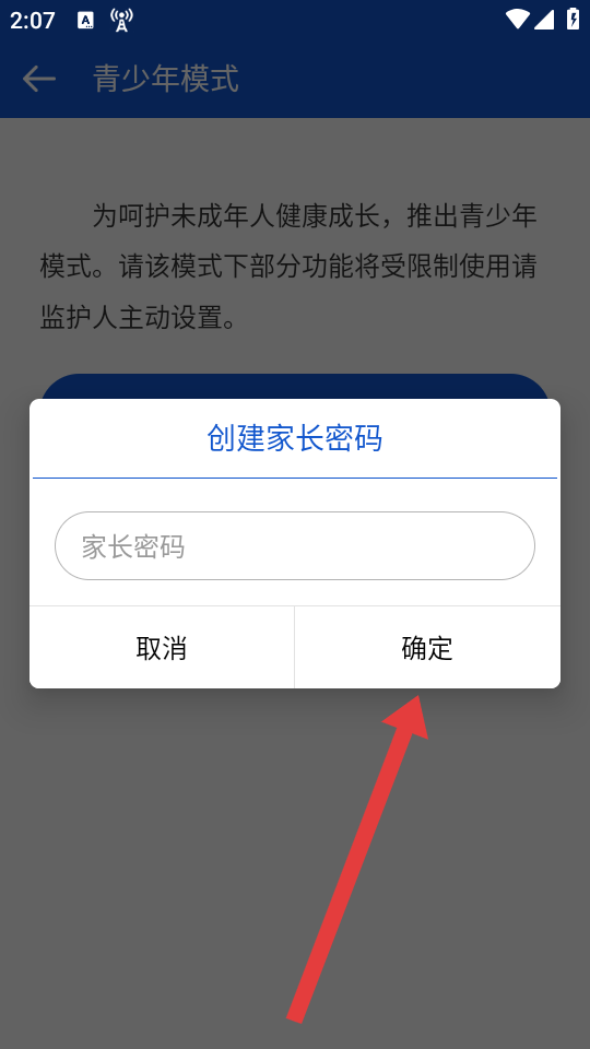 4、在创建家长密码弹窗中,输入家长密码后点击确定,完成青少年模式设置。