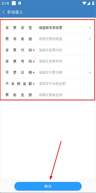 3、在手动录入页面填写发票相关信息后,点击确定按钮完成发票录入。